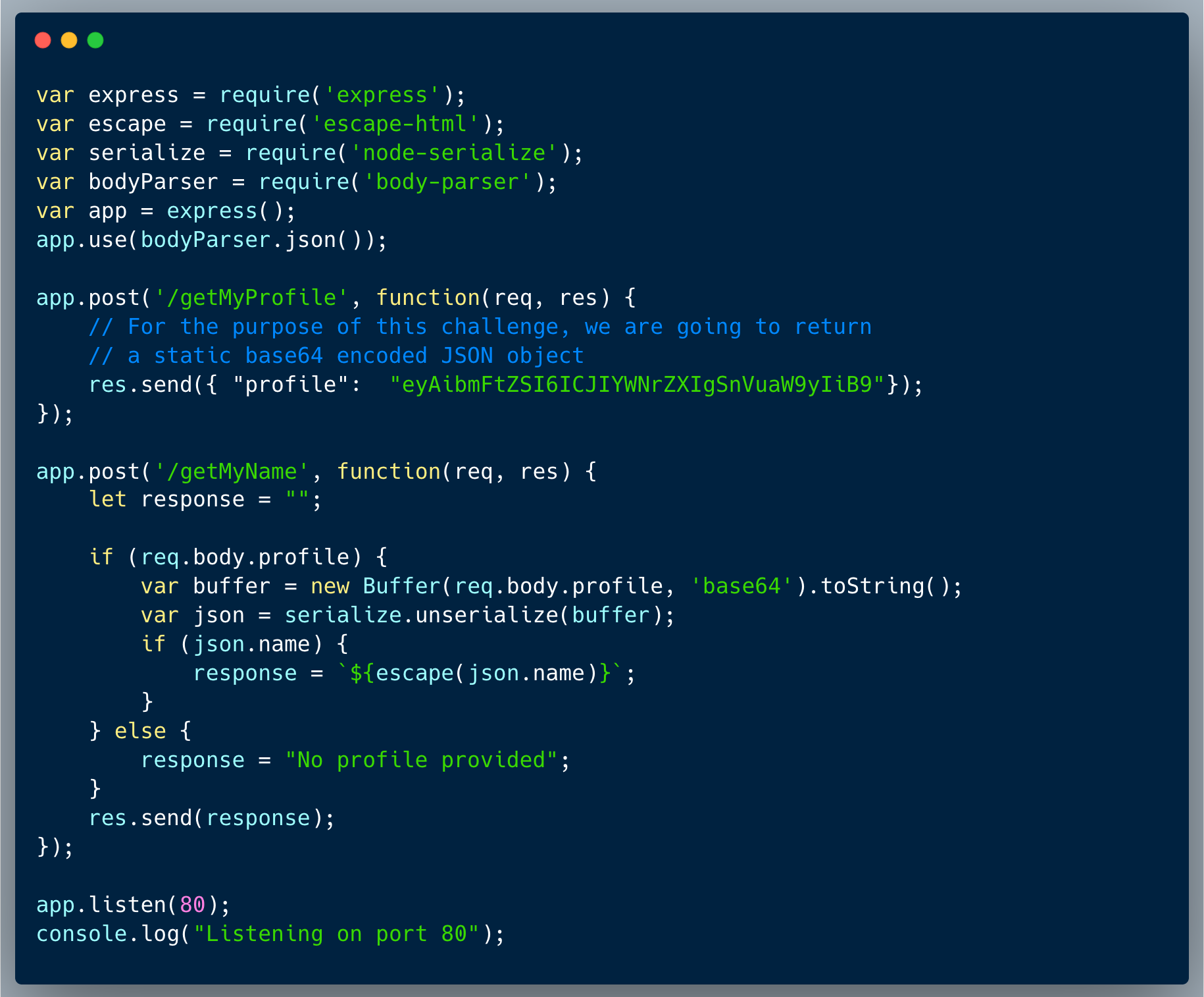 The code in this challenge showcases the handling of a profile object, which has been Base64 encoded to make it easily transferable between platforms. The `/getMyName` endpoint parses the profile and deserializes it into an object. Once that's done, it extracts the name out of it. You can imagine that there could have been other fields on that object which are handled in the same way.